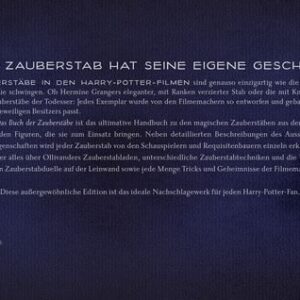 Die Zauberstäbe in den Harry-Potter-Filmen sind genauso einzigartig wie die Hexe oder der Zauberer, die sie schwingen. Ob Hermine Grangers eleganter, mit Ranken verzierter Stab oder die mit Knochenintarsien versehenen Zauberstäbe der Todesser: Jedes Exemplar wurde von den Filmemachern so entworfen und gebaut, dass es zum Charakter des jeweiligen Besitzers passt. Harry Potter – Das Buch der Zauberstäbe ist das ultimative Handbuch zu den magischen Zauberstäben aus den Filmen, ihren Machern und den Figuren, die sie zum Einsatz bringen. Neben detaillierten Beschreibungen des Aussehens und der besonderen Eigenschaften wird jeder Zauberstab von den Schauspielern und Requisitenbauern einzeln erklärt. Außerdem erfährt der Leser alles über Ollivanders Zauberstabladen, unterschiedliche Zauberstabtechniken und die Umsetzung der unvergesslichen Zauberstabduelle auf der Leinwand sowie jede Menge Tricks und Geheimnisse der Filmemacher.
